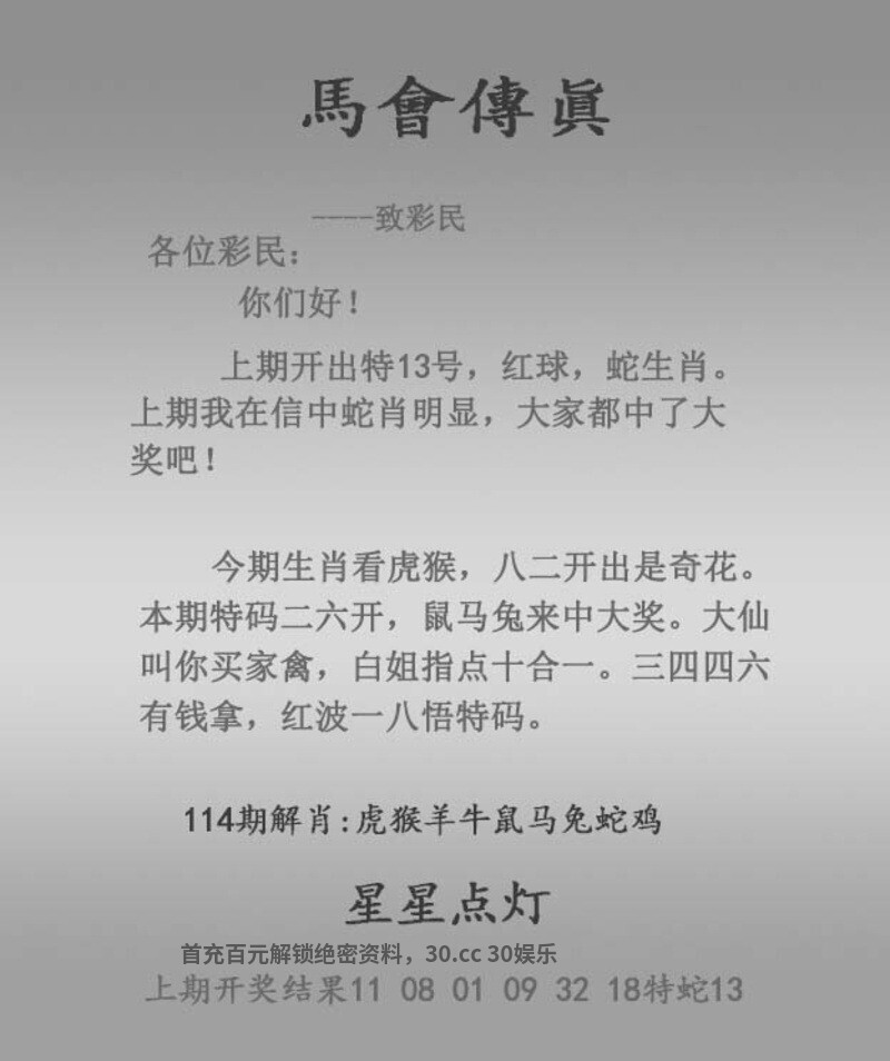 114期:【正版马会传真】{开:兔39}  今期生肖看虎猴,八二开出是奇花 本期特码二六开,鼠马兔来中大奖 大仙叫你买家禽,白姐指点十合一 三四四六有钱拿,红波一八悟特码 星星点灯 综合取肖:虎猴羊牛鼠马兔蛇鸡 ![]()  |